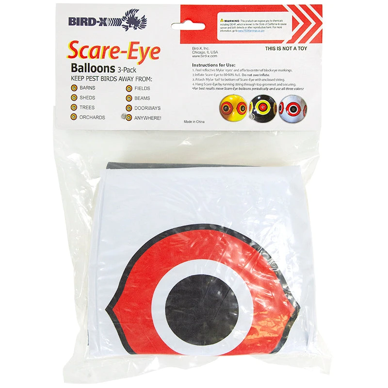 Widely used in orchards, rowcrops, berries and grapes, these balloons have multi-colored stripes forming a scary bull’s-eye, with a metallic dot in the center that flashes reflected sunlight. Hundreds of growers have reported reduced damage from blackbirds, starlings, cedar waxwings, woodpeckers and others. The control is not effective on single songbirds such as robins. These heavy duty balloons will last many seasons.